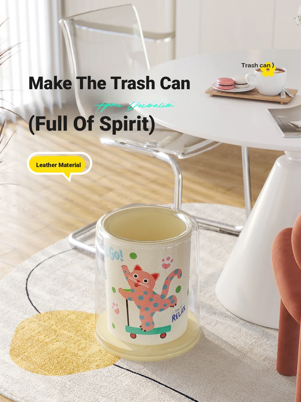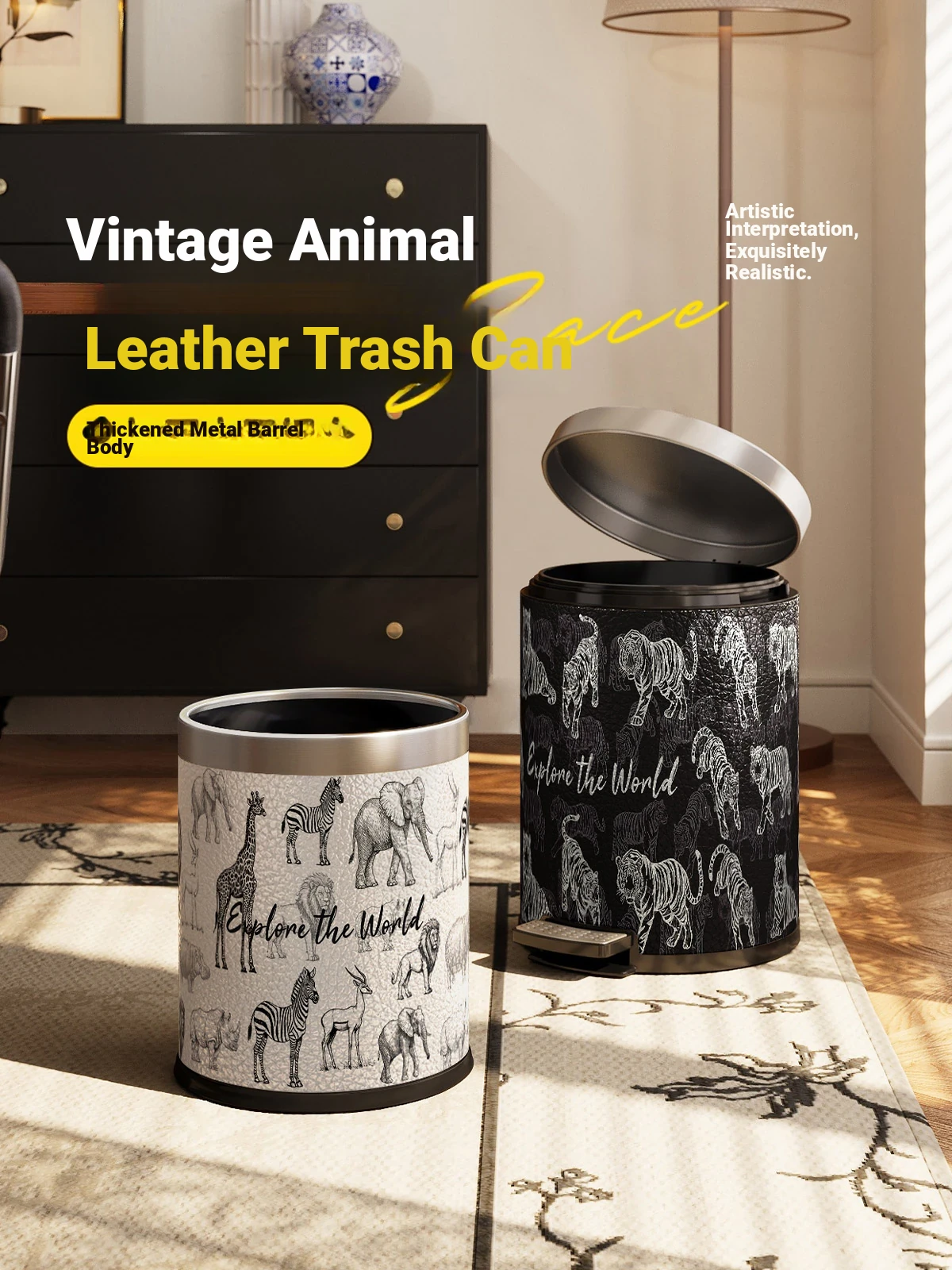 Stylish Stainless Steel Leather Trash Can - Elegant Animal World Design for Home and Living Room, High-End Luxury Double-Layer with Lid