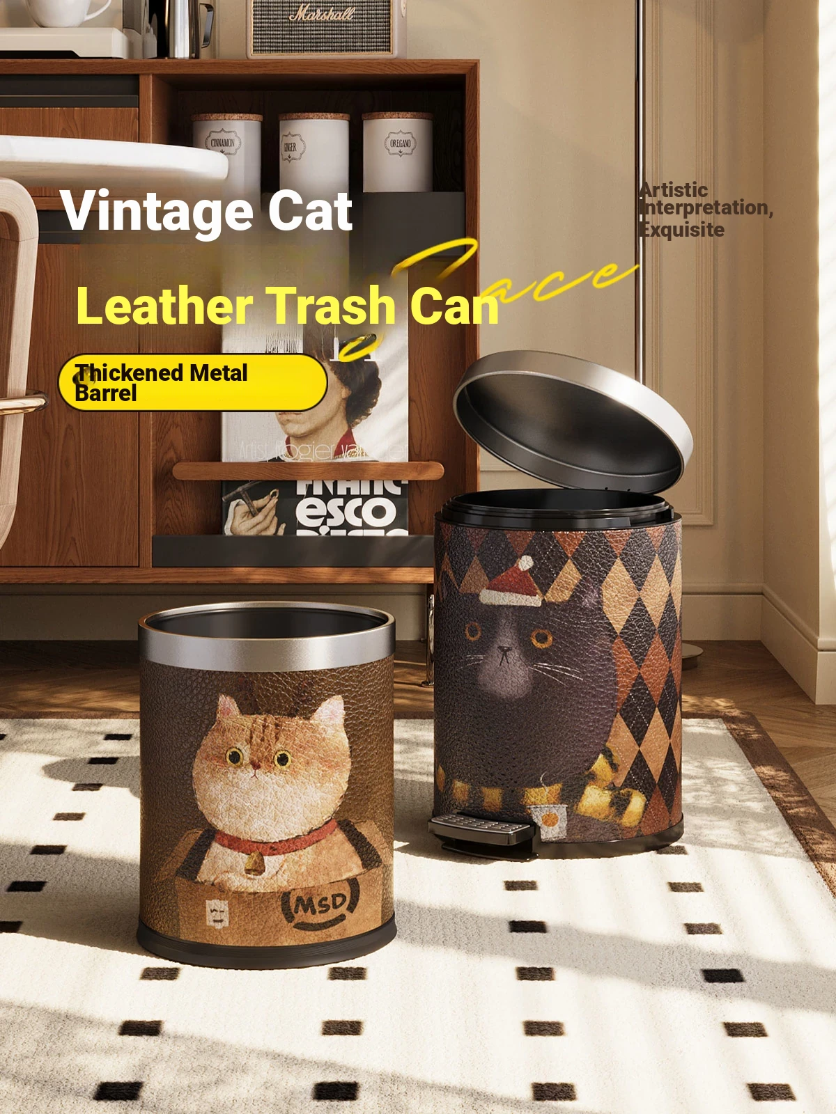 Stylish Stainless Steel Trash Can with Cartoon Cat Design - Dual-Layer, Lid Included, Perfect for Living Room and Bathroom, Vintage Aesthetic for Modern Homes