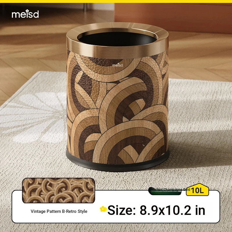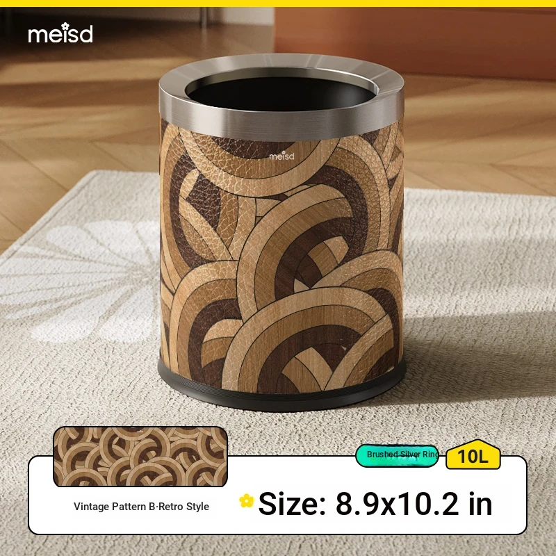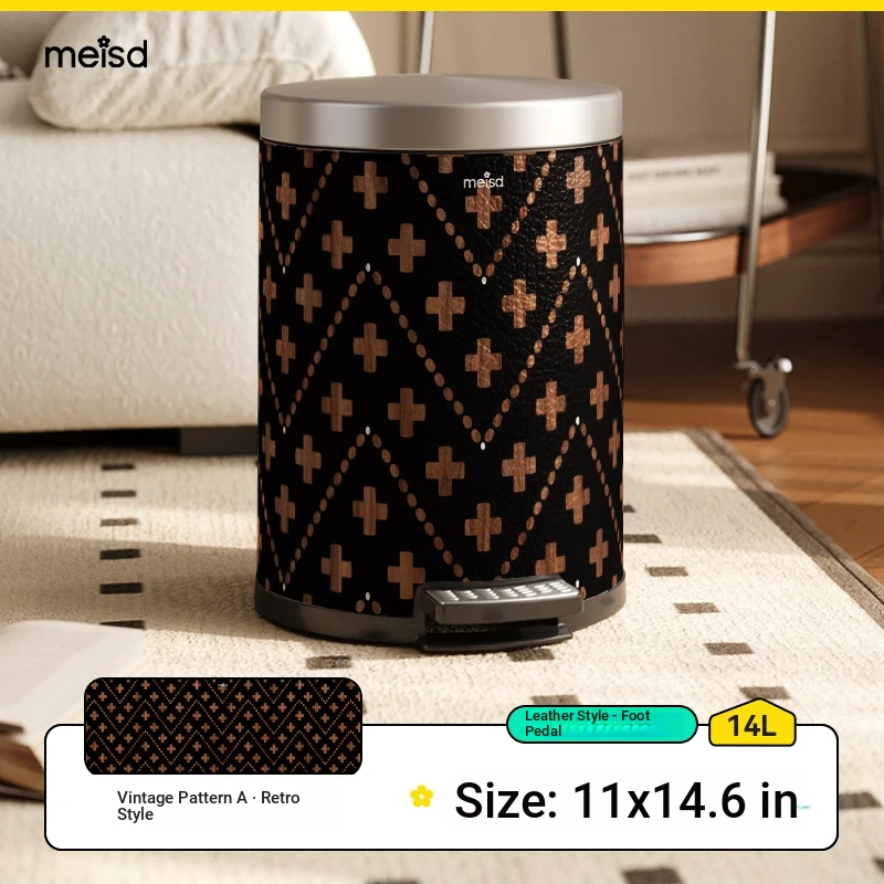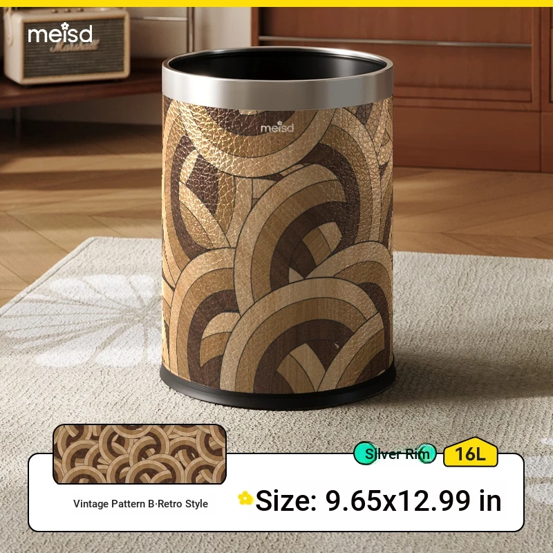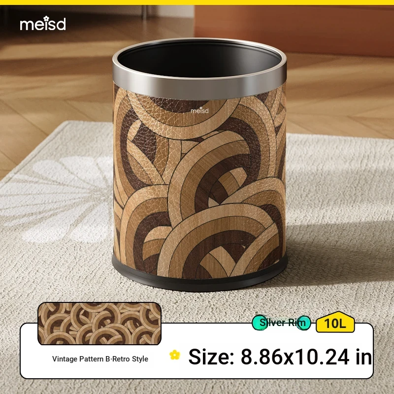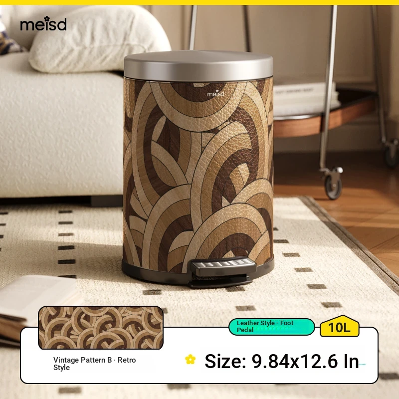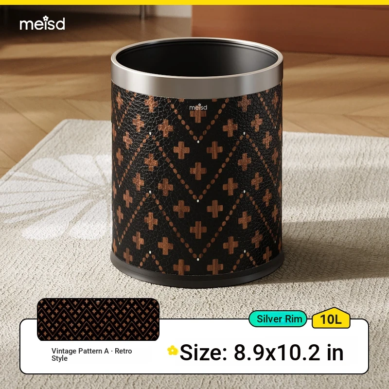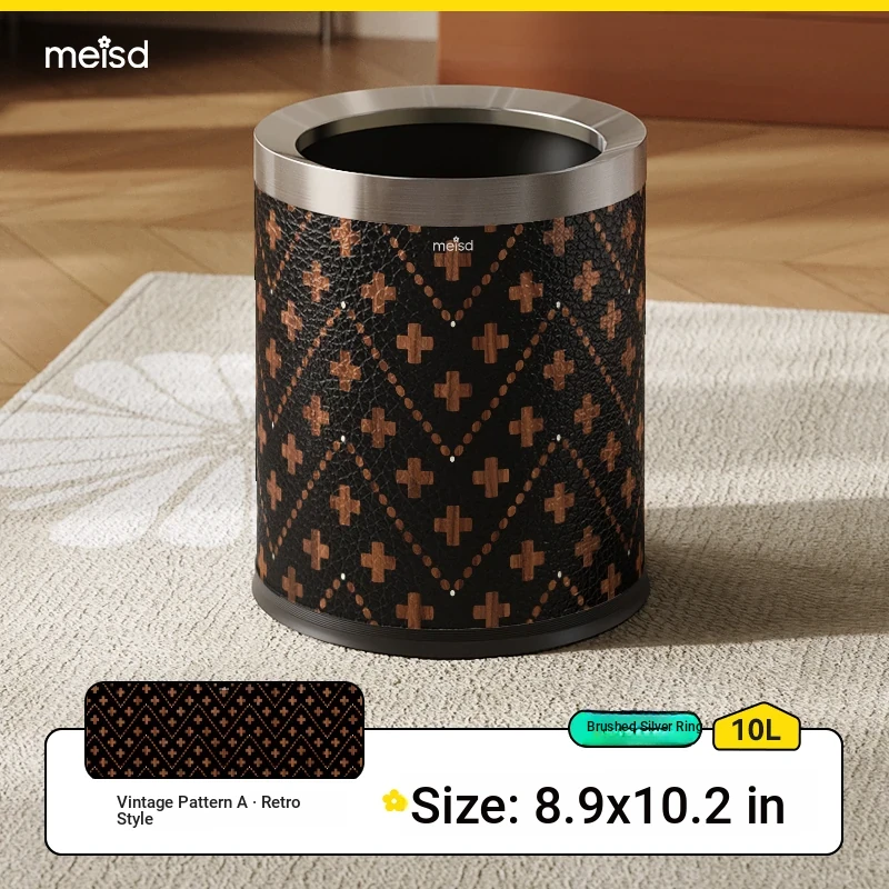 Meisida Vintage Style Leather Trash Can - Elegant Stainless Steel Covered Waste Bin for Home Living Room - Chic and Stylish Design for Modern Spaces
